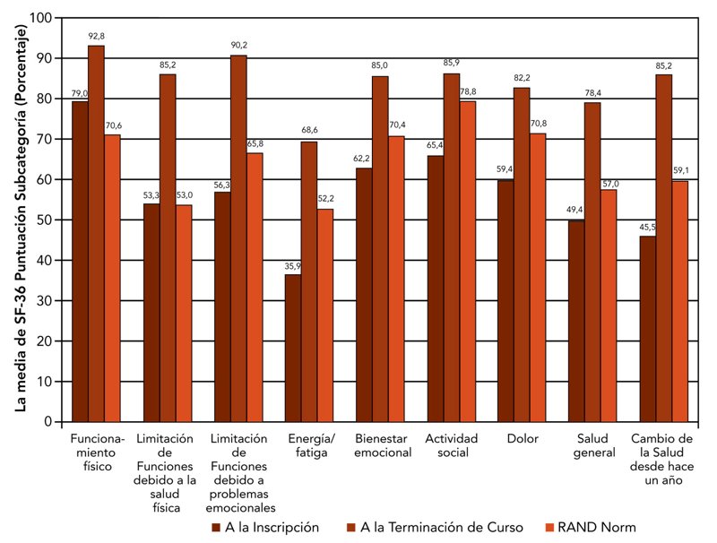 La Figura 2 muestra en forma gráfica el promedio de las puntuaciones del SF-36, antes y después del tratamiento, calculado usando metodología RAND y comparado con las normas de población de EE. UU. para aquellos oficiales que terminaron el régimen.